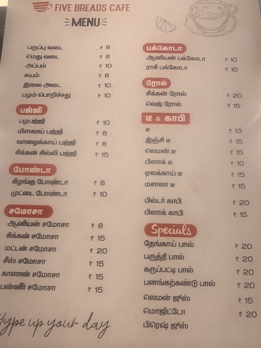 Welcome to FIVE BREADS CAFE, a delightful gem nestled in Cheran Nagar, Coimbatore. This quaint café offers a menu that perfectly blends the artistry of freshly baked breads with an inviting selection of beverages. Coffee aficionados will appreciate the meticulously brewed cups, while tea lovers can indulge in exquisite flavors that elevate the drinking experience.